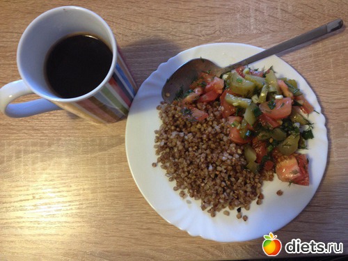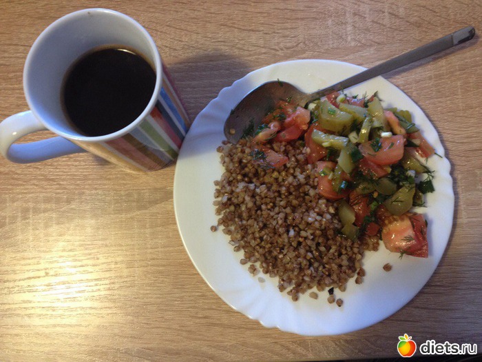 гречка + салат + кофе + бутерброд с маслом (так захотелось хлеба с маслом что-то