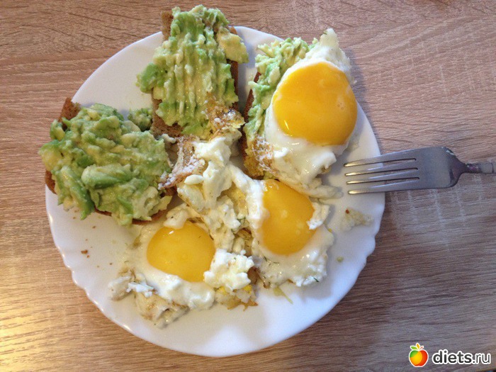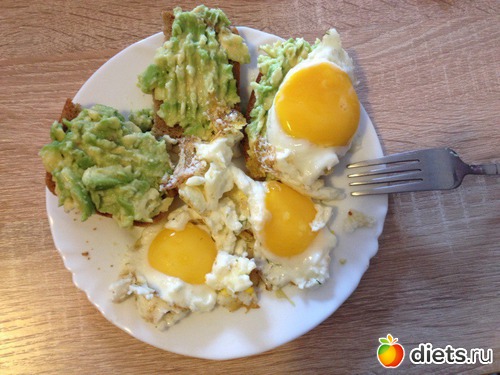 яичница из 3х яиц + 3 бутерброда с 1/2 авокадо + кофе