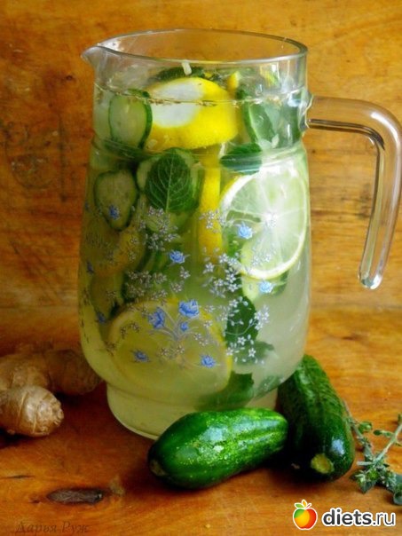 А вот сам рецепт классической воды Сасси: на 2л воды, лимон дольками, 10 листочков мяты, 1 ч.л свежего имбиря, 1 огурец без шкурки кружочками. настаивать ночь в холодильнике.
