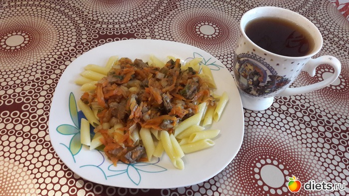 Завтрак - макароны с мясной подливкой 250г + чай с печенькой