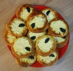 Присыпаем рабочую поверхность мукой, выкладываем тесто и слегка подмешиваем. Делим тесто на равные части и формируем заготовки. Слегка придавливаем каждую заготовку, делаем углубление в центре с помощью стакана, выкладываем чернослив и орехи, добавляем творог и украшаем черносливом.
