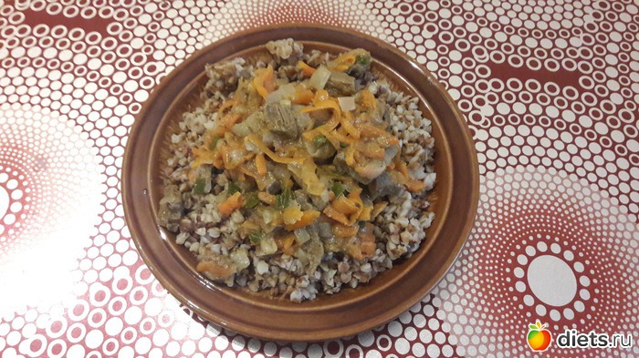 Обед - тушеное мясо с овощами + гречка. Всего: 250г