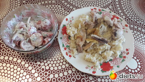 Обед - куриное филе + отварной бурый рис + салат (помидор, лук, зелень, сметана). Всего: 250г