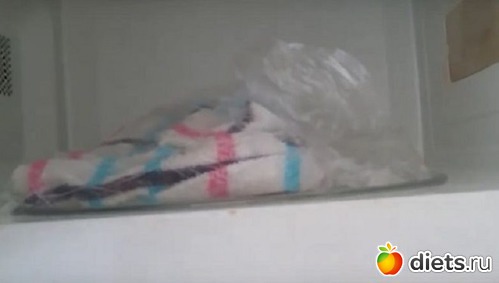 Положи пакет в микроволновую печь. Выставь среднюю мощность и оставь пакет в микроволновке на 1,5 минуты.