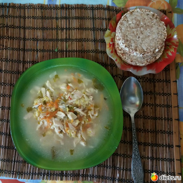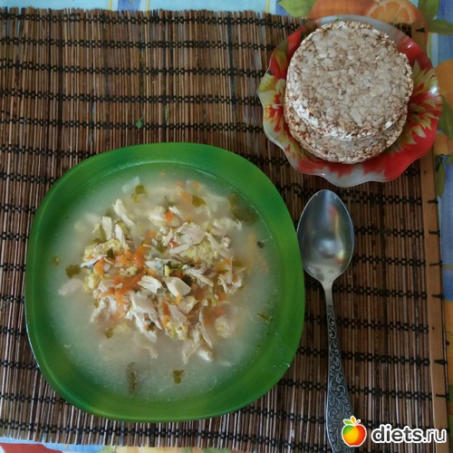Лук можно мелко нарезать, но так как я лук не люблю, то бросила целую луковицу в кипящий бульон и оставила вариться вместе с мясом. Потом, когда лук сварится, вытащить из бульона. Морковь натереть на средней терке. Сыр натереть на средней или крупной терке. Плавленые сырки нам нельзя по системе. Через час вытаскиваем нашу курицу остывать, закидываем тертую морковь и варим еще 15 минут. Аккуратно, руками, как солим, не вываливаем (может слипнуться), помешивая добавляем сыр. Еще варим, а в это время пришло время щипать нашу курочку. Она у нас уже остыла. Ее добавляем в последнюю очередь. Наливаем суп в тарелку, посыпаем свежей зеленью (укроп и/или петрушку). При желании можно есть с ржаными сухариками. Из такого количества продуктов супа получается на 3 обеда.
