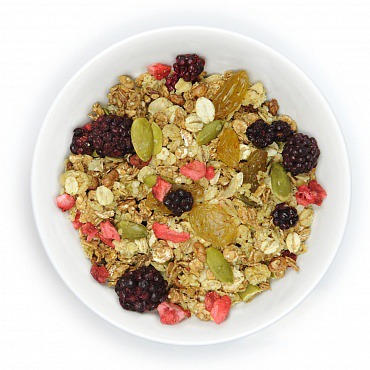 Перед вами – несладкая ягодная гранола, с легкой кислинкой и освежающим послевкусием пряностей. Три основных компонента – зеленый сушеный манго, плоды черемухи и ежевики – работают как хороший оркестр для пищеварения. Это позволяет чувствовать себя хорошо и выглядеть замечательно. Зеленый манго очищает поры лица и освежает. Гранола богата витамином К, очищает кровь и укрепляет кости. Эта гранола ускоряет метаболизм на 20%, что означает, что Вы получаете энергию для активной жизни, а не лишние килограммы. Рекомендовано активным жителям города, тем, кто стремится к успеху и не забывает любить себя.