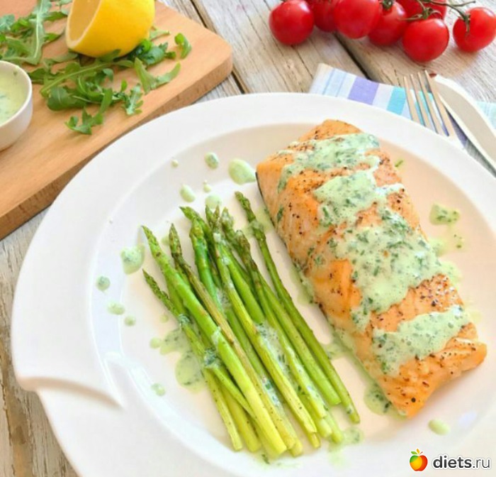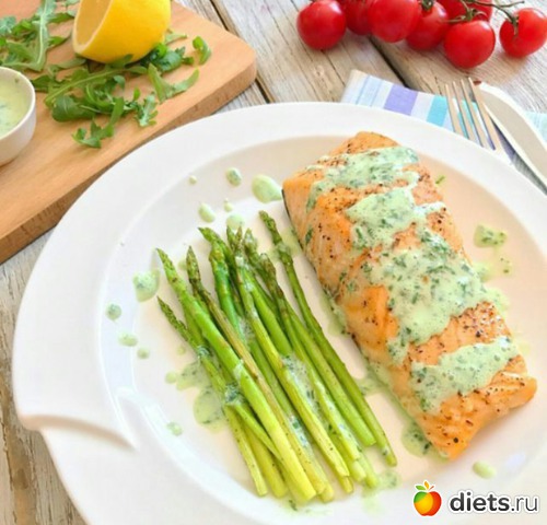 филе форели или стейк (хотя, думаю, любую рыбку можно взять, даже белую) солим, перчим, поливаем немного соком лимончика, я еще добавила чуток приправки KAMIS для рыбы. Спаржу смазываем немного оливковым маслом. В форму выкладываем спаржу (хотя можно заменить молодым картофелем), сверху рыбку нашу и запекать при 200 градусах минут 25-30 (но смотрите по своей духовке)
