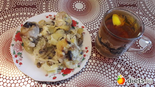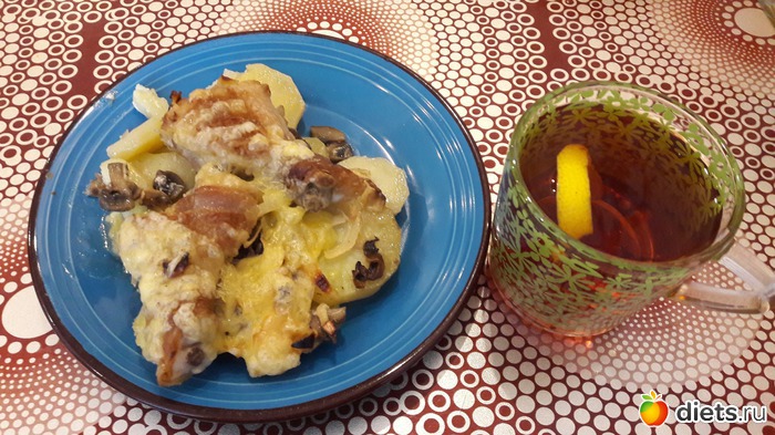 Завтрак - куриные ножки с грибами и картошкой в духовке + чай