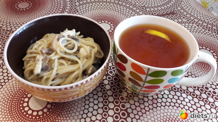 Завтрак - макароны с курицей и грибами в сливочном соусе + чай