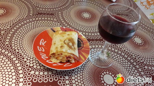 Ужин - закуска из лаваша, колбасы и сыра + бокал красного сухого вина