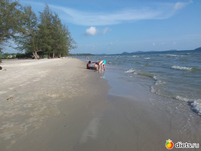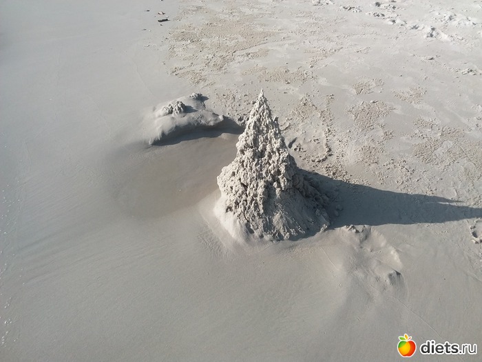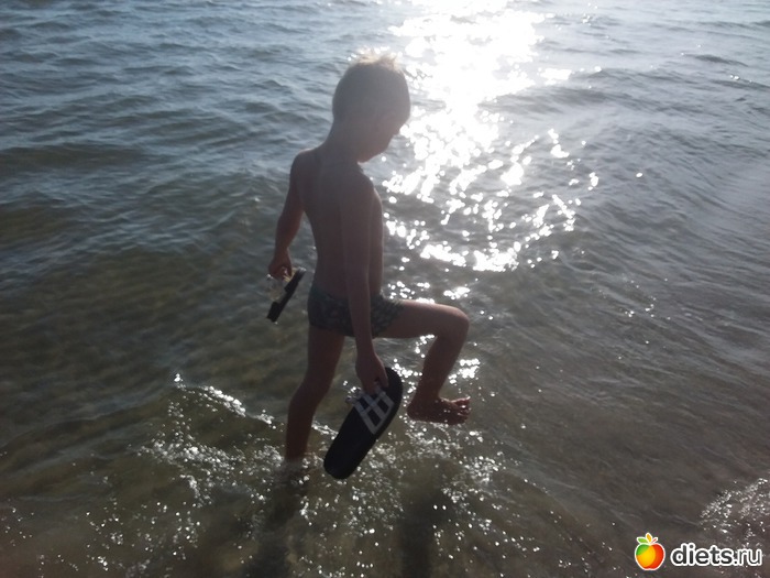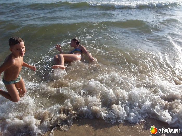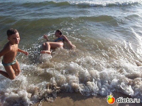 У воды и в воде играют и взрослые и дети, попадаются всякие замки из песка.