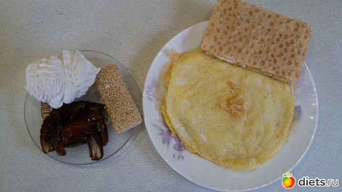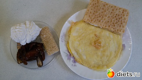 яичница с сыром, сендвич из двух хлебцов с прослойкой из творожного сыра.