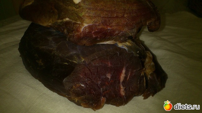 Понадобится кусок лосятины или оленины весом в 1,5 кг (не меньше). За неимением оной сойдёт и говядина, как для ростбифа. Кусок должен быть замороженным. Взять этот кусок и положить в форму, не размораживая и отправить в чуть разогретую духовку 75-100 градусов С. Лучше это делать с вечера. Оставить в духовке на ночь, 10-12 часов.