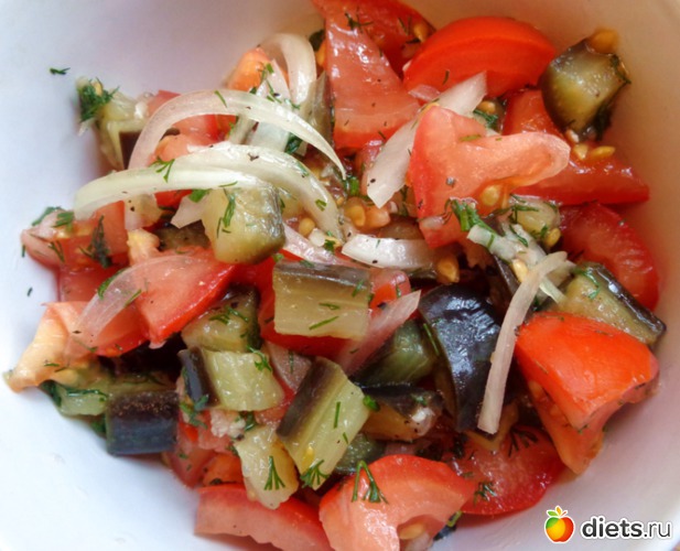 Этот салат с баклажанами и помидорами пахнет летом и счастьем, у него великолепный простой, но благородный вкус.