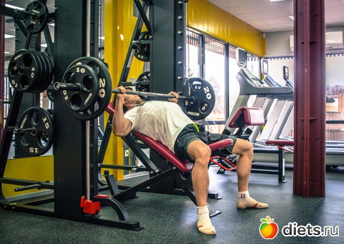 Как правильно выполнять упражнение: зафиксировать положение спинки, установить необходимый вес. Выполнять жим штанги вверх лежа или сидя под углом 45 градусов.