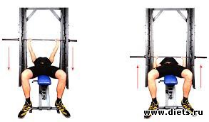 Преимущество тренажёра Смита в том, что он позволяет заниматься безопасно. Штанга двигается по заданной траектории, таким образом вы не заваливаете руки вперёд или назад. К тому же на отрезке, по которому двигается штанга, есть несколько крючков. На них штанга может фиксироваться. Это очень удобно: если вы переборщили с весом, легко можете остановиться на середине, поставить гриф на крючки и поменять блины.