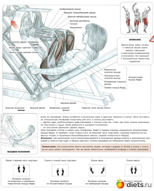 Как правильно выполнять упражнения: установите вес, ложитесь на сиденье. Поставьте ноги на платформу на ширину плеч. Сгибайте и разгибайте ноги, поднимая и опуская платформу. Толкайте платформу пятками. Поясница должна быть плотно прижата к сиденью. Руками можно держаться за ручки.