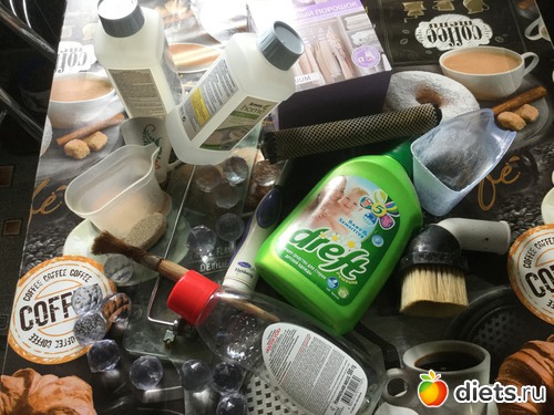 Батарейка от наручных часов и губка для посуды, остальное на фото.