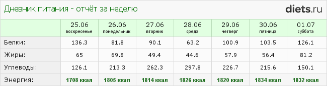 Вес по дням недели с 26 июня по 2 июля