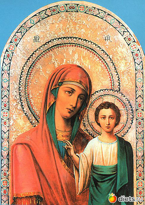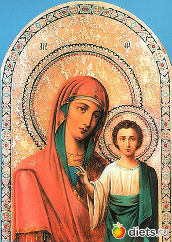 Пресвятая Богородица в пурпурном одеянии и благословляющий Богомладенец были изображены на золотом фоне в мозаичном обрамлении.