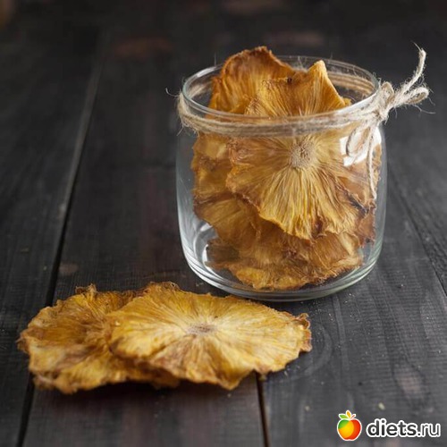 Количество калорий в вяленых ананасах, конечно, зашкаливает, но при этом они содержат много железа, марганца, фосфора и прочих минеральных солей. Эффективным жиросжигателем тропический фрукт считается благодаря ряду органических кислот и пищевых волокон. Как и сушеный виноград, он позитивно сказывается на работе щитовидки.