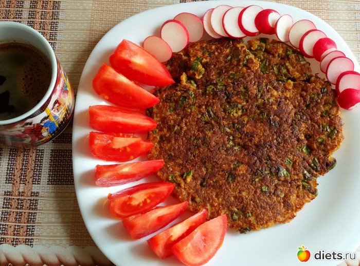 Гречневая лепёшка с луком, овощи.