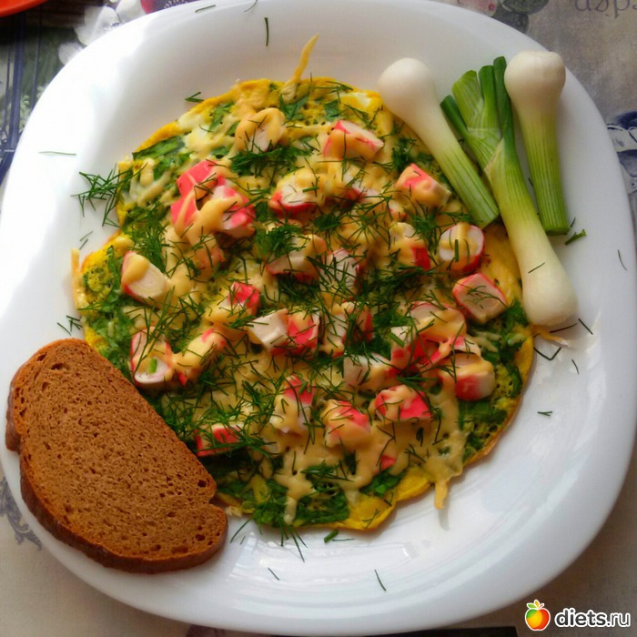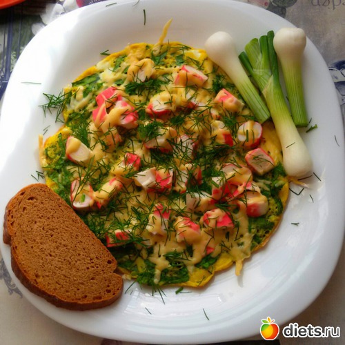 Омлет из яиц, шпината и крабового мяса, хлеб с лучком.
