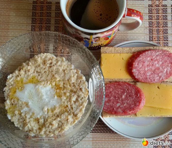 Овсянка с маслом, хлебцы с сыром и колбаской, кофе.