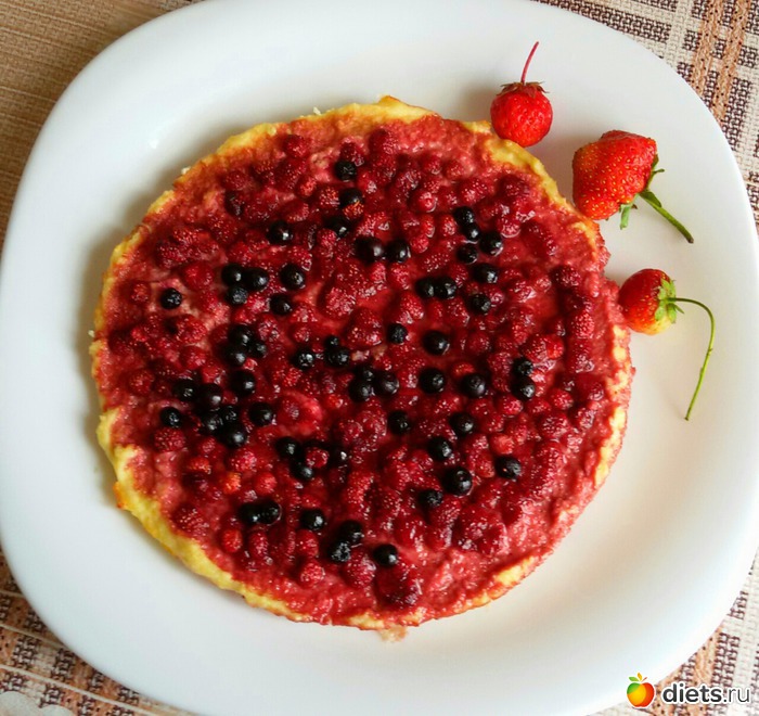 Рецепт: пачка творога+ яйцо+30 гр манки+сахзам ( у меня здесь нет, я добавила 10 гр сахара). Выложить тесто на дно формы, а сверху ягоды. В духовку на 20-30 мин при 180°.