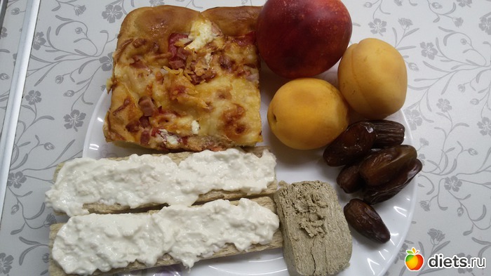 Кусочек пиццы. Хлебцы с творожным сыром. Немного халвы. Финики. Нектарин и 2 абрикоса.