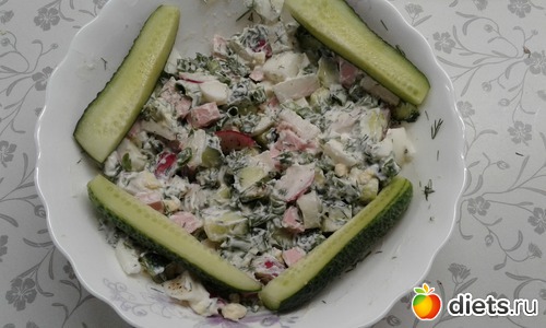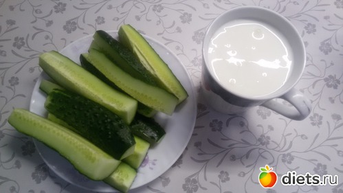 Сделала салат по типу окрошки. Огурцы, редиска, зелень, яйцо, варенная колбаса и заправила мягким творогом. Получилось очень вкусно, как со сметаной. Огурцы.