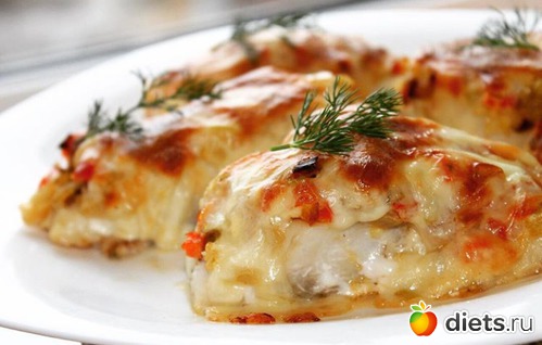 Укладываем рыбку в форму, сверху овощами накрываем, посыпаем тертым сыром и в духовку минут на 20-30. Зависит от вашей духовки.