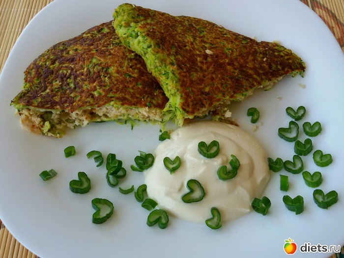 1 Натереть на терке луковицу и кабачок. Добавить в овощную массу яйца, соль, молоко, перец молотый, рубленую зелень, отруби. Тесто должно быть по консистенции чуть гуще, чем на блины.