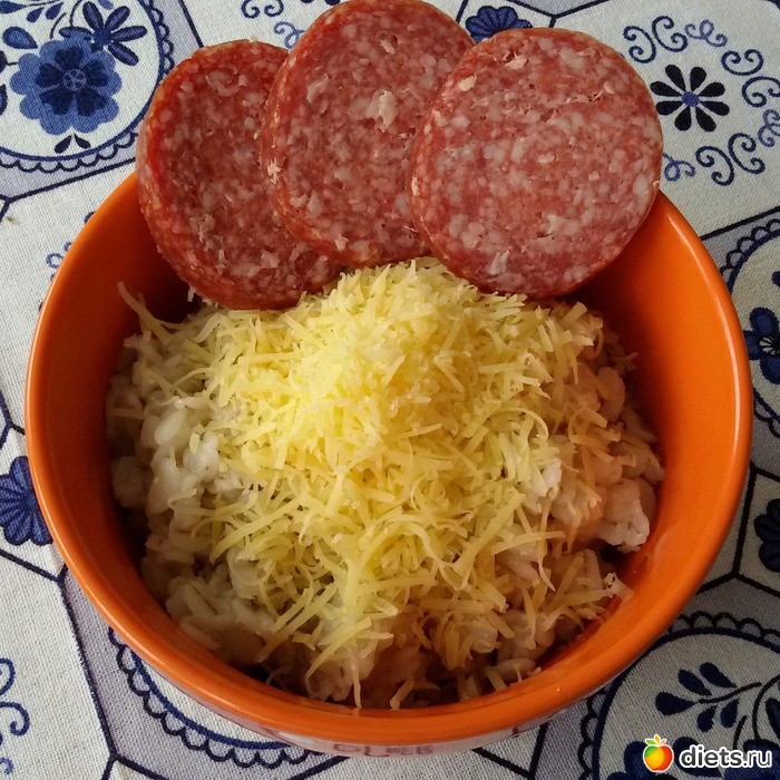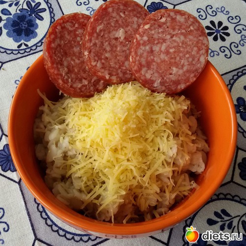 Каша ячневая с сыром, колбаска.