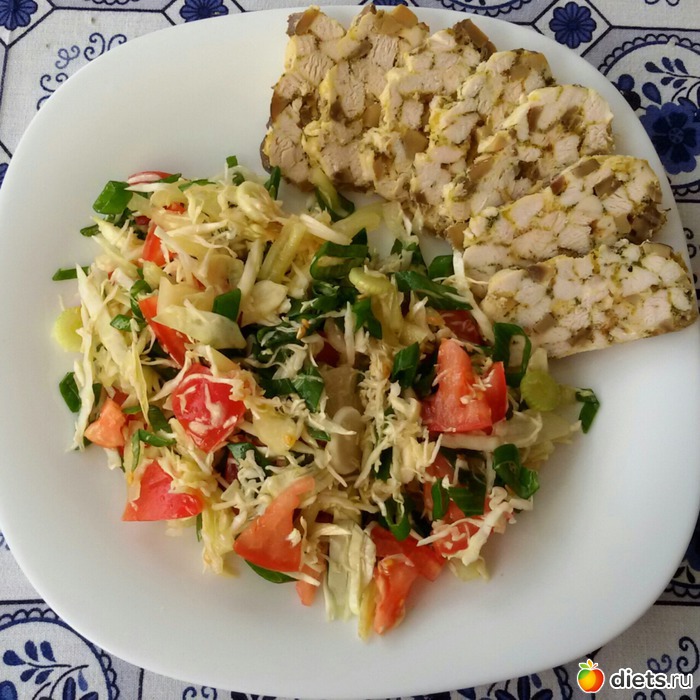 Куриный рулет, салат. В этот раз сделала его с грибами. Очень вкусно!