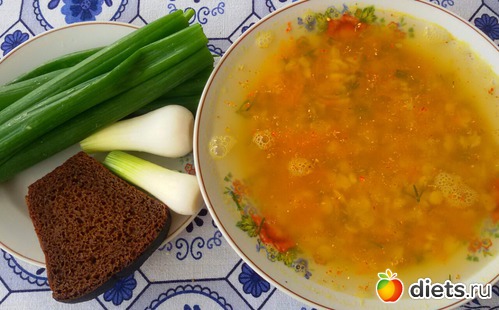 Суп гороховый на курином бульоне, хлеб, лук.