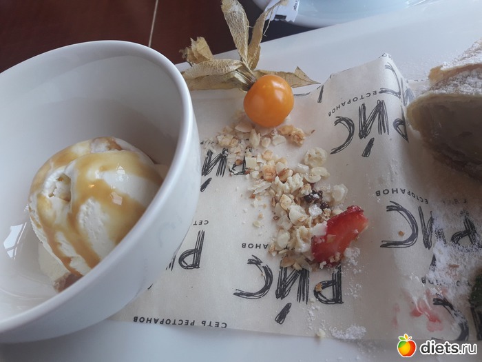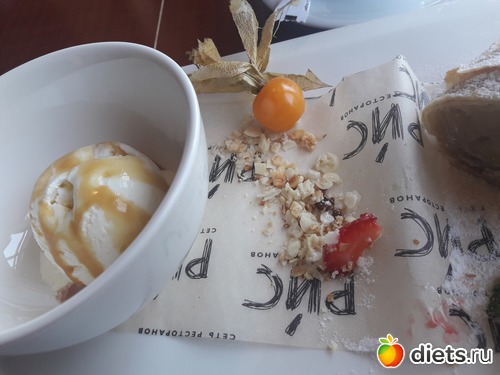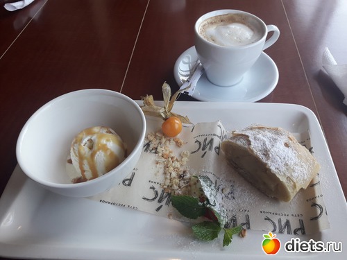 Ходили с подружкой пару дней назад в "Рис", взяла себе капучино с корицей и штрудель яблочный с ягодами и шарик мороженого (такое громкое название)