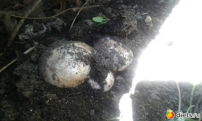 Короче вчера подводит меня с загадочным видом и показывает как лезут из земли шампиньоны, правда не возле елок и сосенок, как хотелось и мечталось