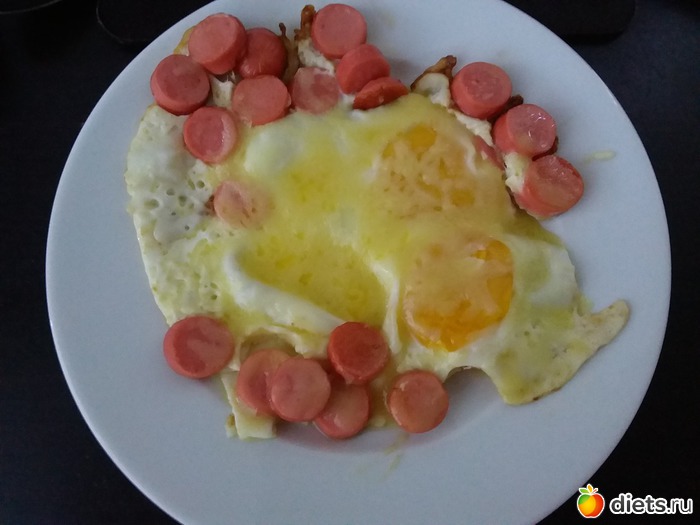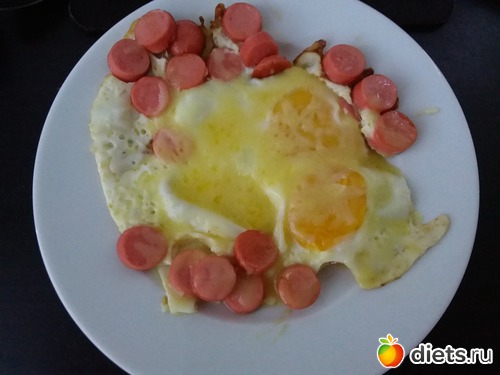 Мой завтрак яишница из двух яиц с сосиской и сыром и кофе с молоком без сахара.