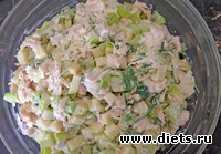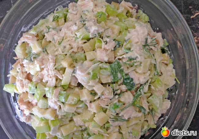 Грудку отвариваем до готовности, охлаждаем. Режем на маленькие кусочки. Яблоко режем на кубики. Сельдерей режем на кубики... Читать полностью