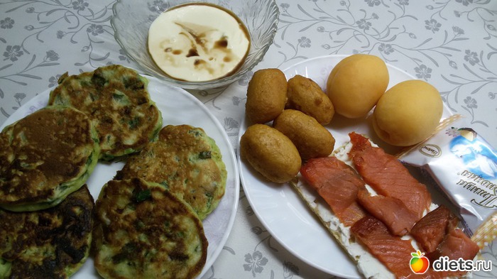 Луковые оладушки со сметаной и соевым соусом. Хлебец с творожным сыром и рыбой. Маленькие сосиськи в тесте. Абрикосы. Конфета. Зеленый чай.