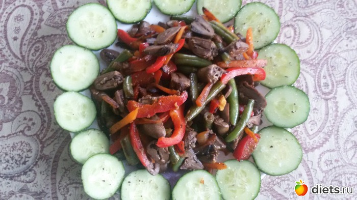 Тушенные куринные сердечки с овощами. Огурец. Зеленый чай.