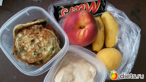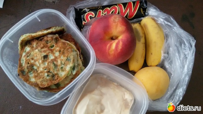 Луковые оладушки со сметаной и соевым соусом. Шоколадка. Абрикос. Персик. Банан откусила немного и выкинула, очень не вкусные