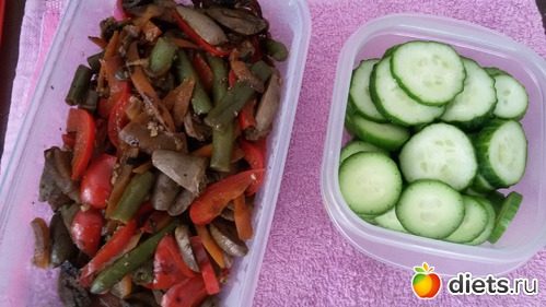 Тушенные куринные сердечки с овощами. Огурцы. Зеленый чай.