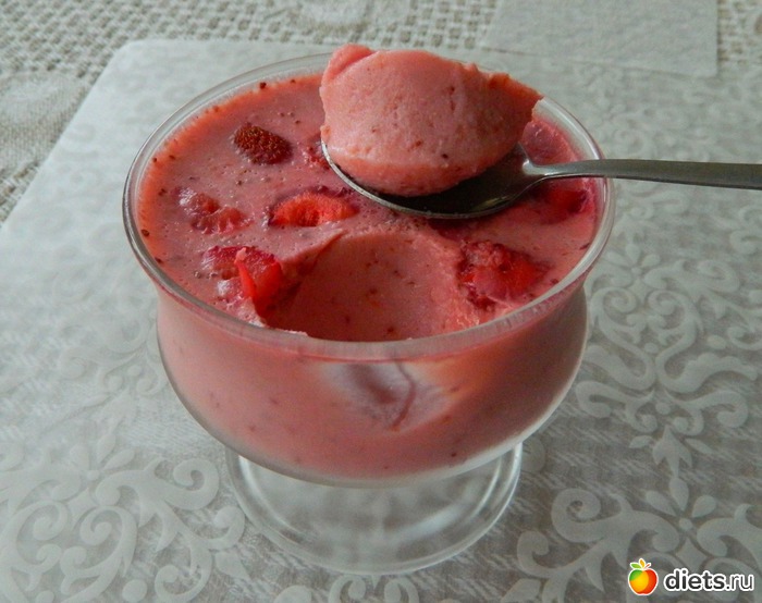 Рецепт: клубника+йогурт, вжик блендером. Влить растворенный в воде желатин. Опять вжик блендером и разлить в креманки. Я ещё набросала кусочки клубники. Поставить в холодильник на ночь. Я добавляла сахзам. Но можно сахар или мёд. Тогда калорий больше.