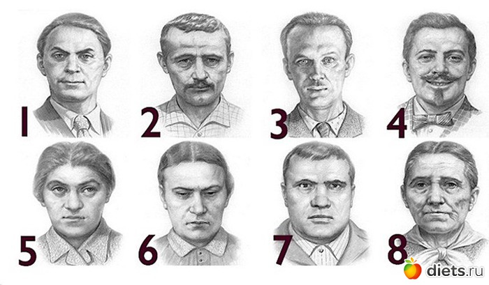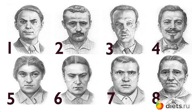 Посмотрите на портреты этих 8 людей и выберите того человека, которого бы вы ни за что не хотели встретить вечером в темном переулке, поскольку его внешность вызывает отвращение или пугает. Теперь можете узнать характеристики к выбранному портрету.