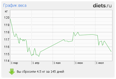 Стыдно, но пока я почти ничего не добилась в уменьшении веса. Свободные копейки забирает ремонт в деревне (провели в дом воду, установили ванну и туалет, сделали отопление). Можно сказать, здоровье важнее, Но маме 78 будет в октябре и она устала от ремонта, надо спешить. Если бы она послушала нас раньше... Дала добро, когда поняла, что скоро не сможет носить зимой воду с колодца. Так что питание здоровым не назовешь. Конечно, я сама виновата, и в наших условиях можно найти правильное решение. Но я устала срываться и нервничать. Муж сказал, попробуй хотя бы 0,500 терять в месяц, за десять лет вес в идеальный превратится