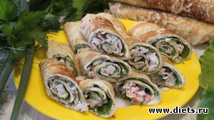 Блинчиком смазываем соусом, кладем лист салата, посыпаем мелко порезанными крабовыми палочками. Заворачиваем рулетик. Нарезаем и подаем к столу.