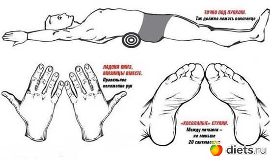 Чтобы сделать валик, скатайте полотенце и перехватите лентой в разных местах. Упражнения выполняются на горизонтальной поверхности в течение 5 мин. Положение зависит от локализации «проблемного места». Для похудения живота на валик ложатся спиной. Упражнения также исправляют осанку.