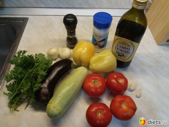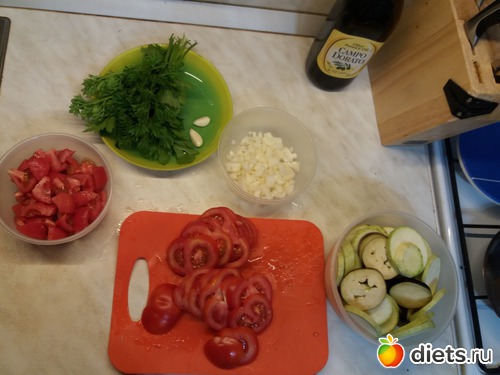 С 2х помидор снять кожу (подержать 10 сек в кипятке и она легко снимется) и порезать кубиками. Лук тоже мелко порезать. Оставшиеся помидоры, кабачки и баклажаны порезать кружочками.